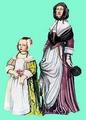 На даме осенний наряд, подобный тому, изображение которого оставил нам Венсеслаус Голлар. Корсаж, узкий до талии, сходится спереди в небольшой зубец. Вырез глубокий, горизонтальный, задрапированный кружевным воротником "берта" и окаймленный спереди кружевной оборкой. Надетый на плечи большой квадратный шейный платок с кружевной каймой, застегнутый у шеи брошью, закрывает вырез корсажа. Широкие до локтя рукава украшены большими отложными кружевными манжетами. Перчатки носили обтягивающие, до локтя. Достаточно пышнная, часто с небольшим шлейфом юбка драпировалась у талии и складками опускалась до пола. Поверх юбки надевали элегантный полотняный передник, окаймленный кружевом. На голове - мягкий капюшон "шаперон".