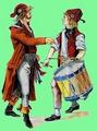 На барабанщике короткая крестьянская куртка - так называемая carmagnole. Его панталоны застегиваются спереди с помощью специальной складки, удерживаемой тремя пуговицами. Красный фетровый остроконечный фригийский колпак, украшенный красной синей и белой - трехцветной - кокардой Французской революции, стоит прямо.