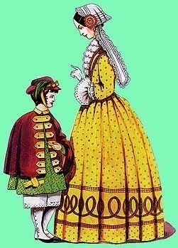 На девочке пелеринка длиной "три четверти" с высоким воротом, застегивающаяся спереди с помощью украшенных тесьмой петель. Под пелериной платьице чуть выше и панталончики чуть ниже колена. Hoги обуты в длинные гамаши, застегивающиеся с наружной стороны ноги. На голове у девочки фетровая шляпка с низкой тульей и широкими полями.